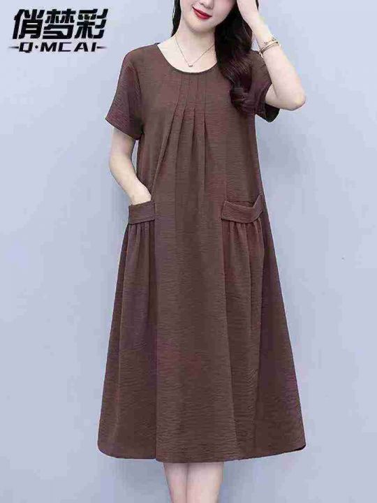 麻棉胖妈妈夏季短袖连衣裙遮肚裙中老年女加肥裙子,,...