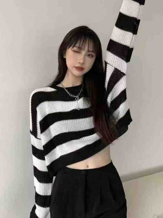 早秋新款靓妹短款宽松撞色黑白条纹针织长袖小衫,有垫...
