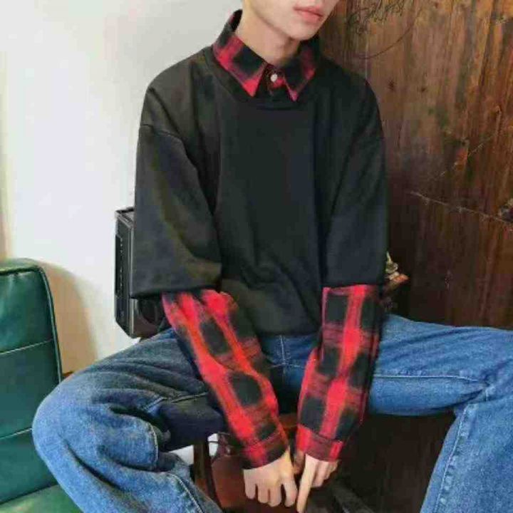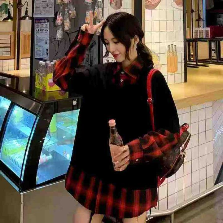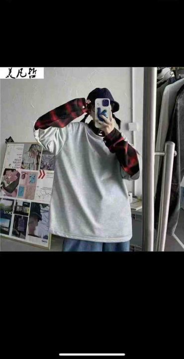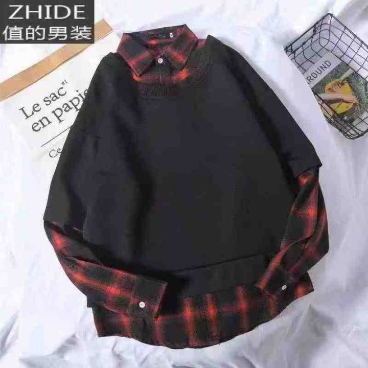 爆款假两件卫衣春秋新款美式复古格子上衣宽松休闲,数...
