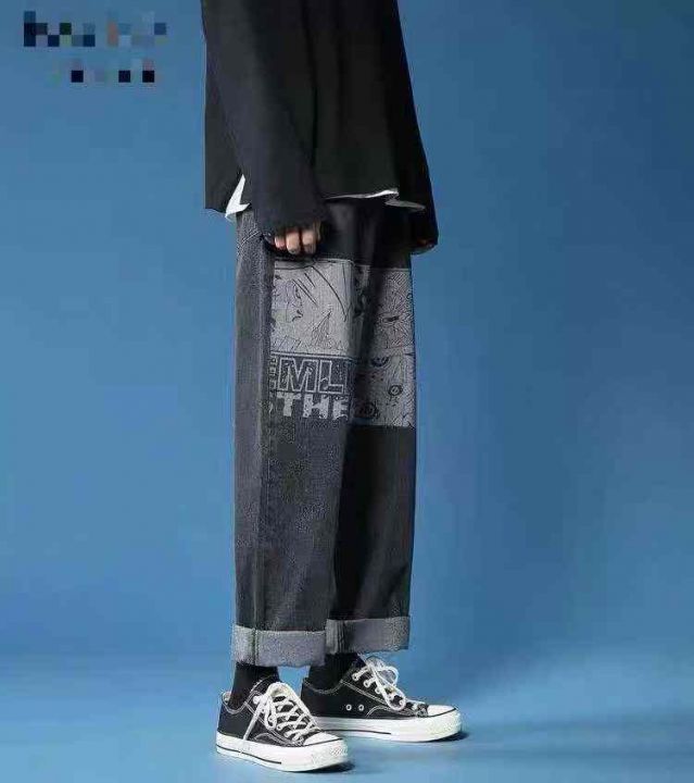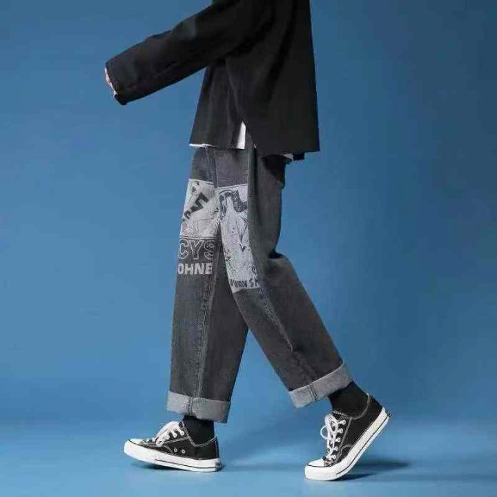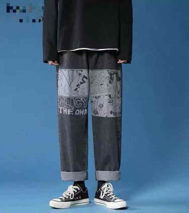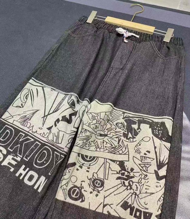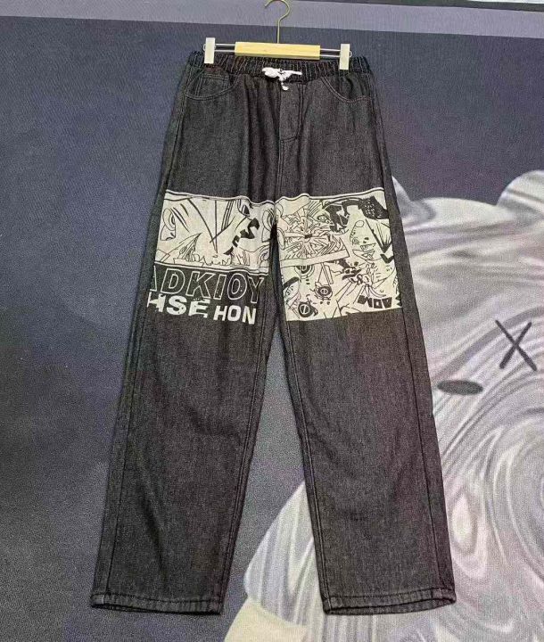 天猫在售款450件左右高品质男装潮牌个性涂鸦加绒加厚松紧腰阔腿牛仔裤,内里加黄金绒,单款单色,S-3XL,独立包装带吊牌