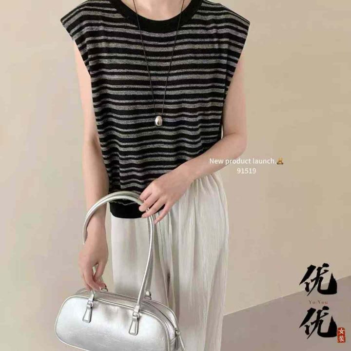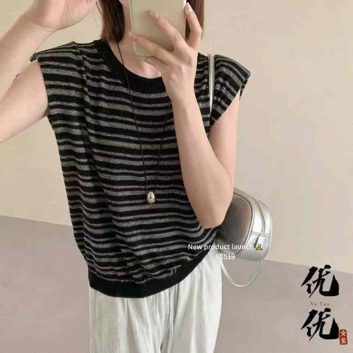夏季新款宽松显瘦通勤百搭撞色条纹圆领无袖针织T恤,...