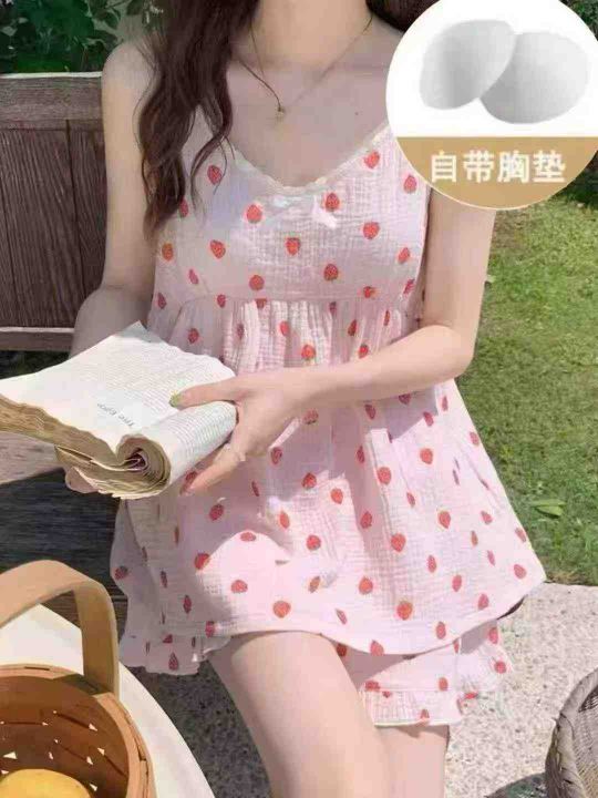 吊带睡衣纯棉带胸垫甜美可爱公主风,纯棉吊带套装,面...