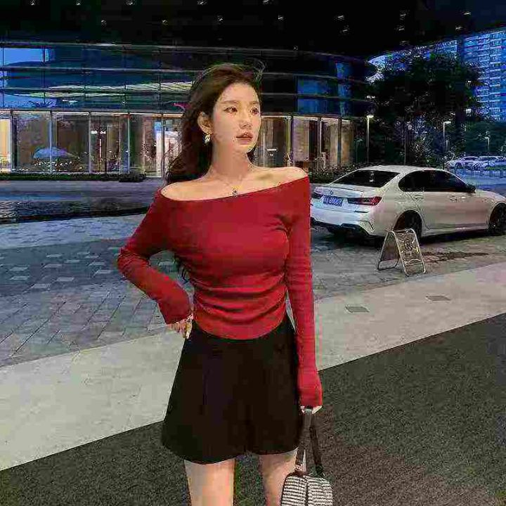 一字肩纯欲小众露肩修身显瘦内搭打底衫百搭褶皱长袖针织衫,120件,清6.5