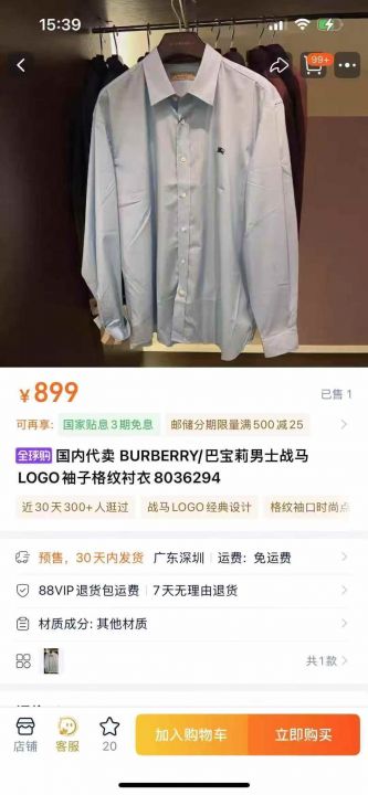 Burberry巴宝莉长袖衬衫1000件左右。 货号:2978