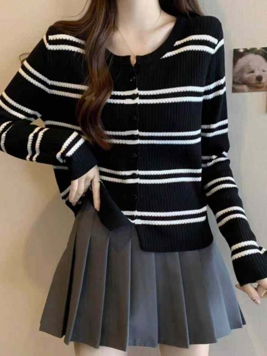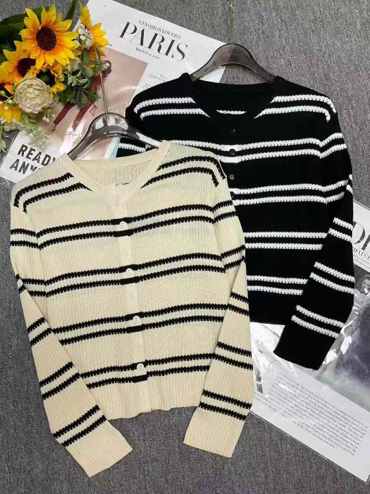 秋季新品宽松韩版别致休闲V领撞色条纹长袖针织开衫,独立包装,黑色条纹为主,均码面料软糯舒适弹力大,60件左右,全清7.9元超低价秒杀!