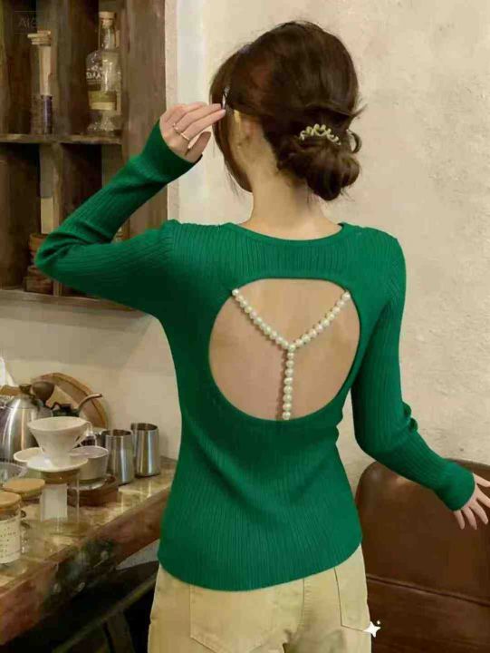 秋季新款设计款后背珍珠装饰坑条包芯纱套头毛衣,独立...
