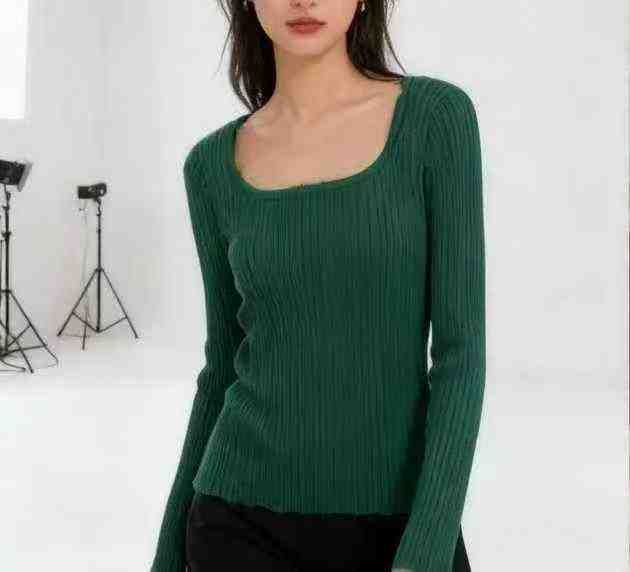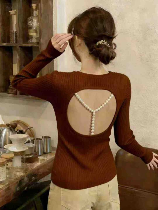 秋季新款设计款后背珍珠装饰坑条包芯纱套头毛衣,独立...