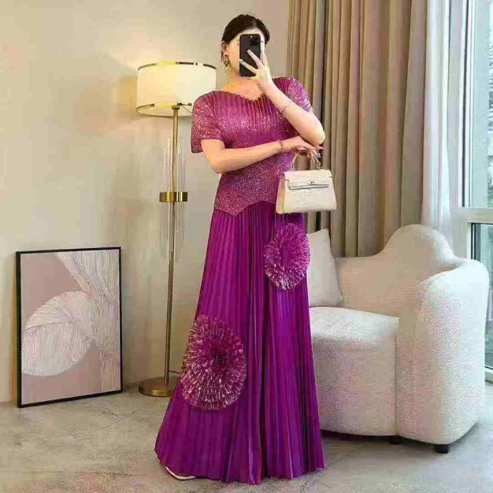 100套左右三宅轻奢重工烫金大盘花长半裙褶皱两件套收腰短袖蝙蝠衫两件套!均码,高弹力!做高货的来!独立包装!全清48.8 分货50