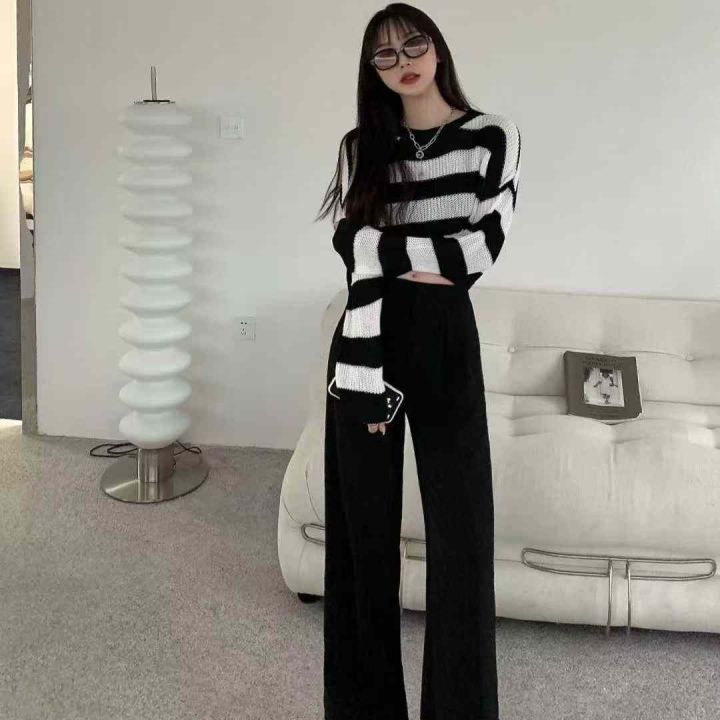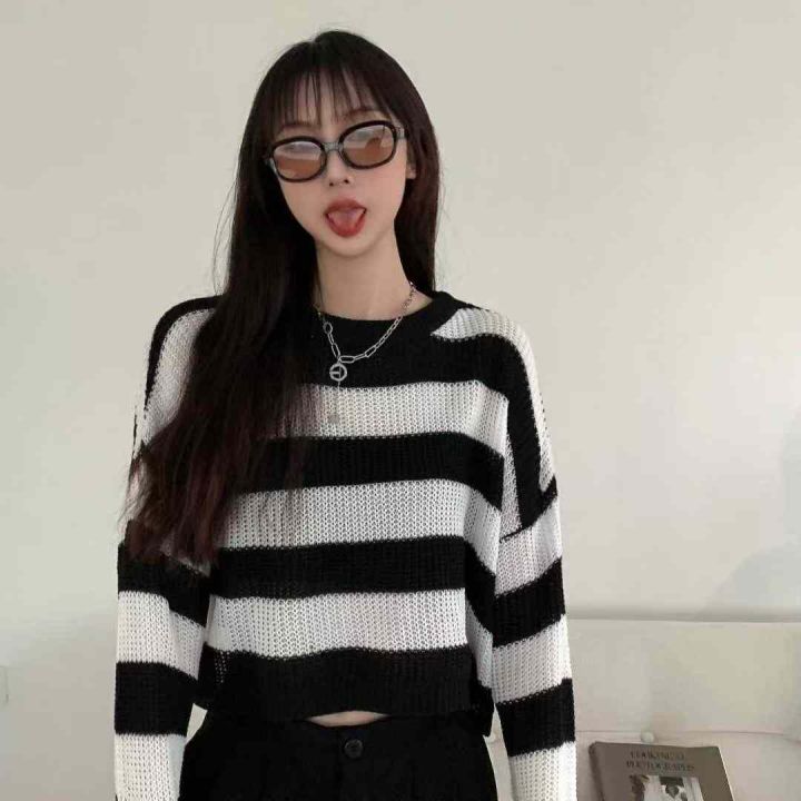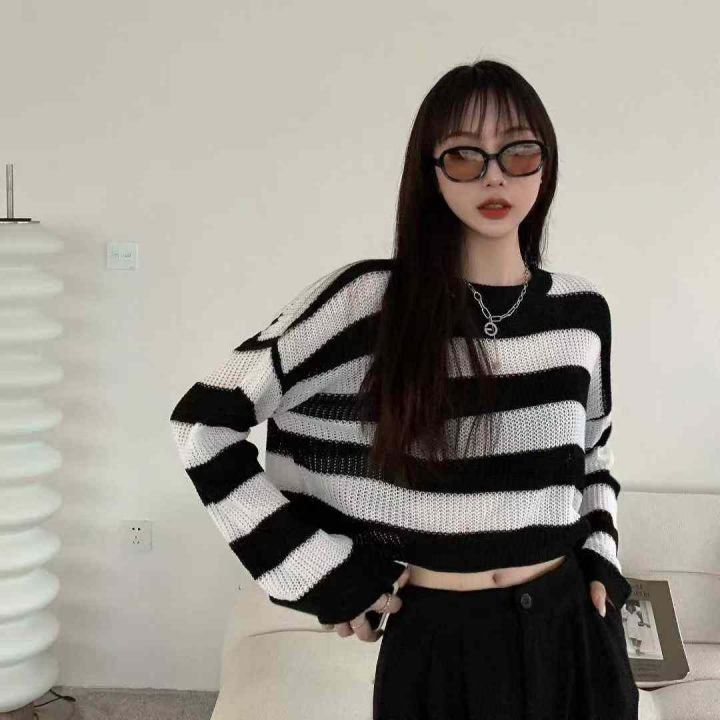 早秋新款靓妹短款宽松撞色黑白条纹针织长袖小衫,有垫...
