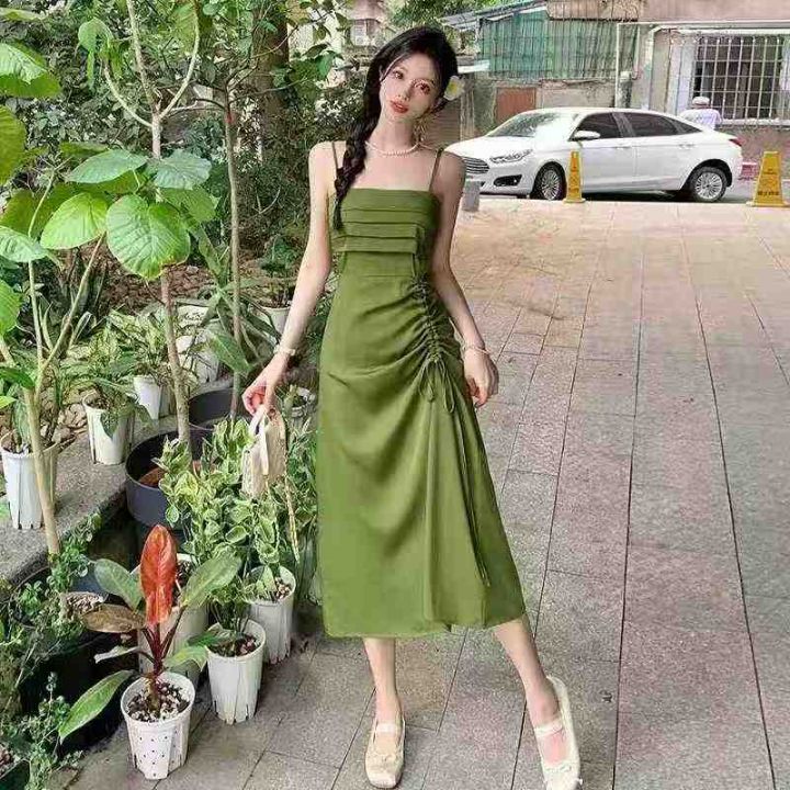 新款夏显瘦气质过膝法式复古裙女抽褶裹胸修身性感绿色...
