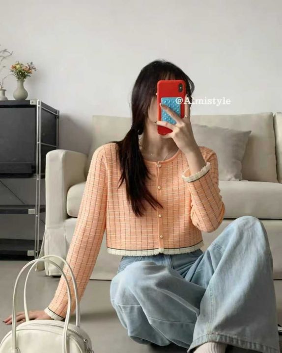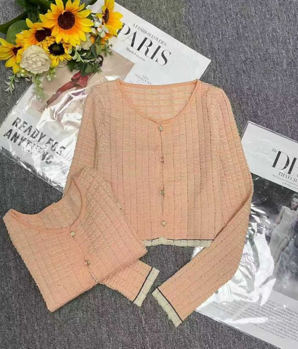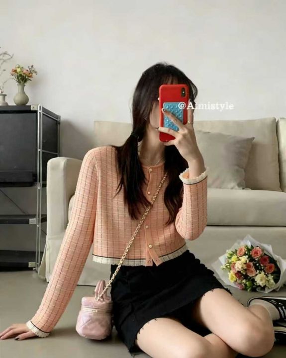 早秋新款小香风温柔立体方形纹理肌理感圆领针织开衫,...