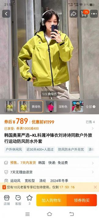 科隆冲锋衣可以分货三个颜色刘诗诗都在穿的...
