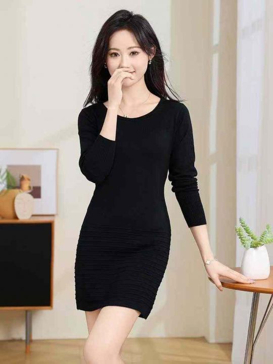 秋冬新款加厚高弹力女装圆领包芯纱套头毛衣连衣裙,独...