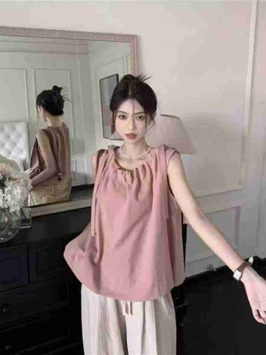 全清价5.9元韩系甜美设计感蝴蝶结背心洋气减龄褶皱外穿无袖上衣,独立包装...