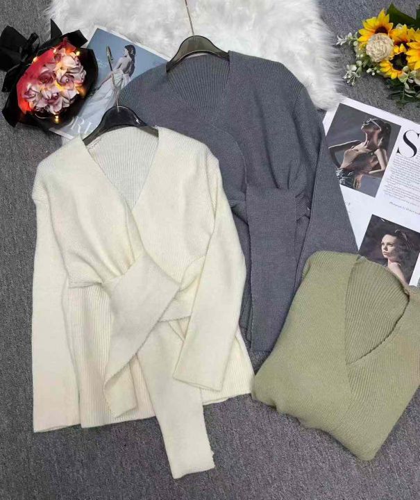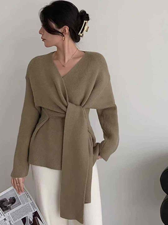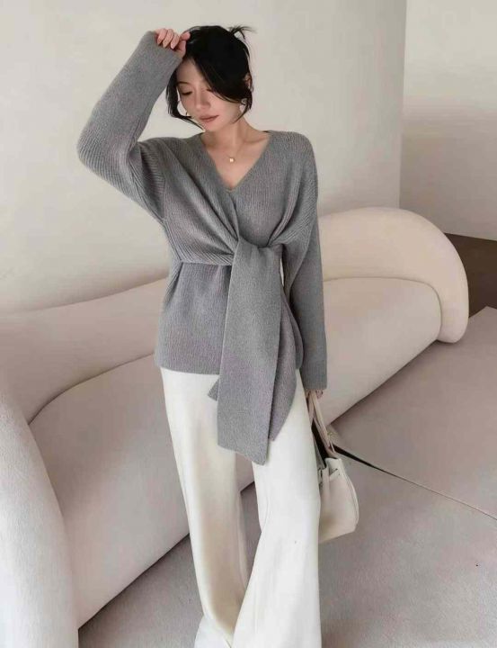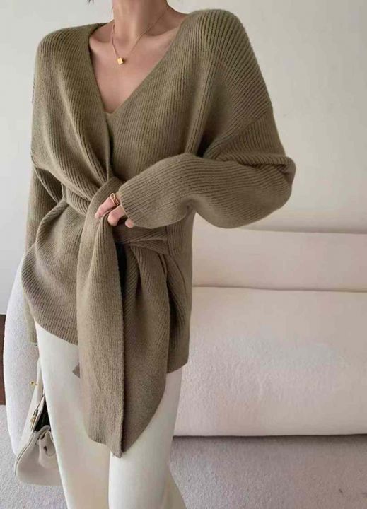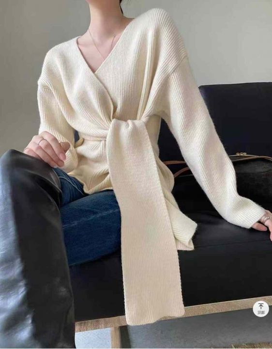 秋冬新款高品质加厚法式小众设计感绑带收腰V领慵懒松弛感套头毛衣,独立包装,均码面料软糯厚实,56件,全清7.9元超低价秒杀!