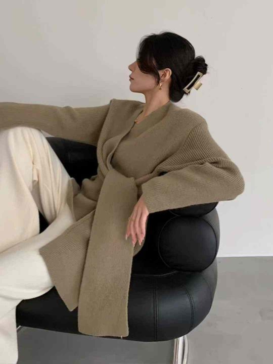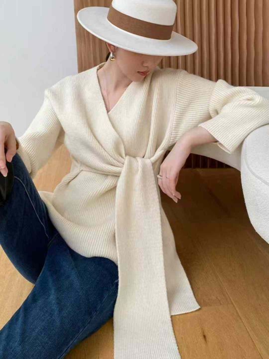 秋冬新款高品质加厚法式小众设计感绑带收腰V领慵懒松...