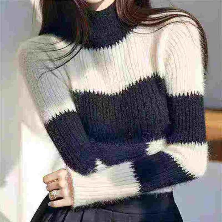 上新全清:10.8一件慵懒风黑白撞色半高领轻糯针织毛衣,[爱心]250件左右,...
