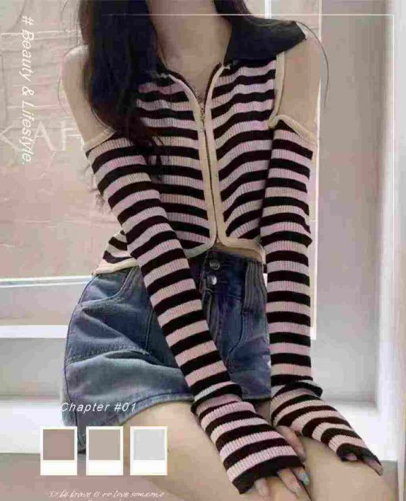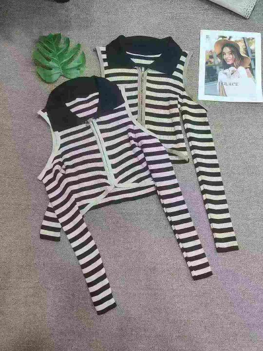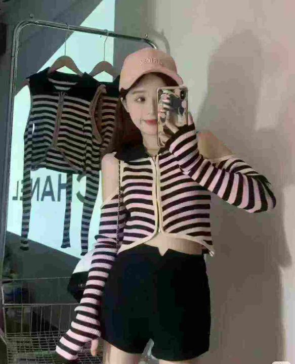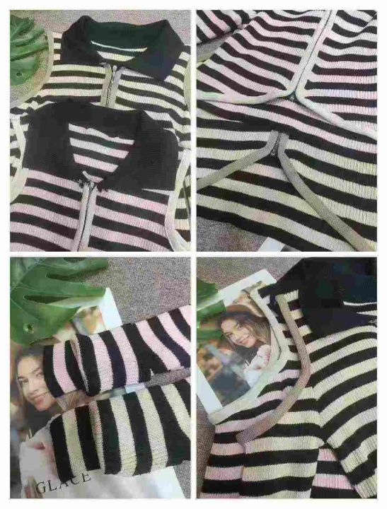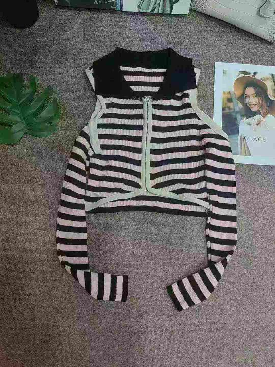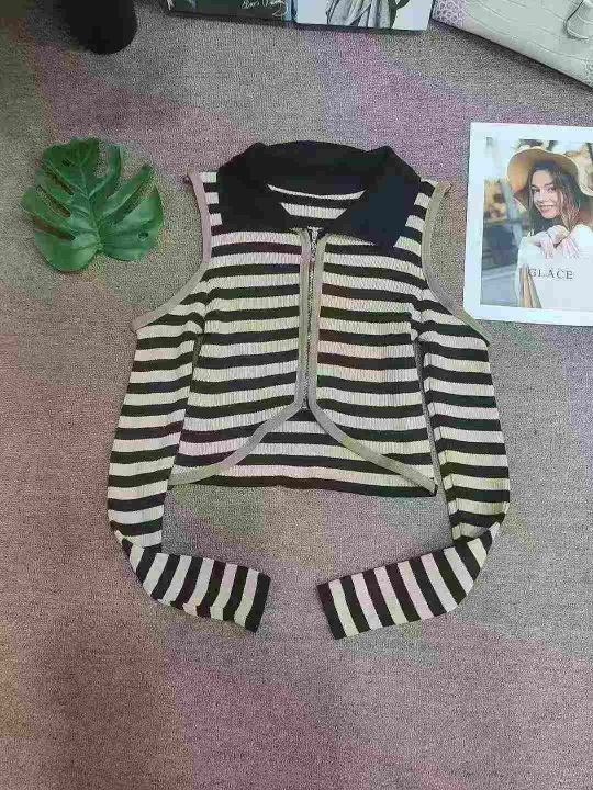 性感露肩条纹针织衫春秋高腰修身显瘦时尚翻领拉链开衫上衣,独立包装,均码,380件,清7.5,分➕1