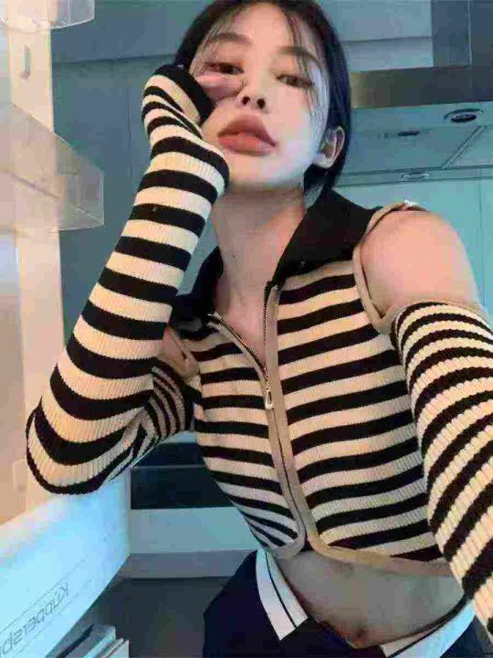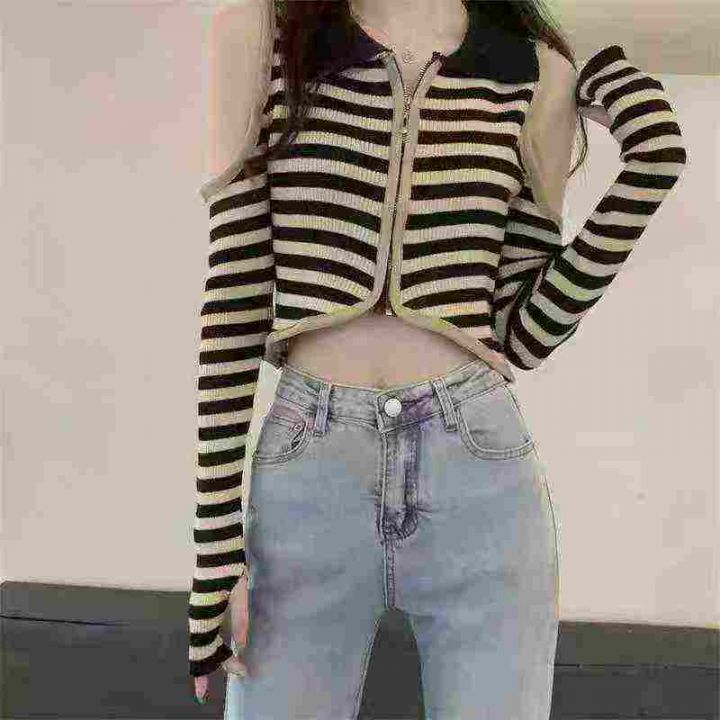 性感露肩条纹针织衫春秋高腰修身显瘦时尚翻领拉链开衫...