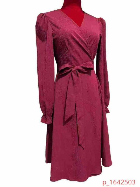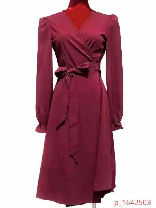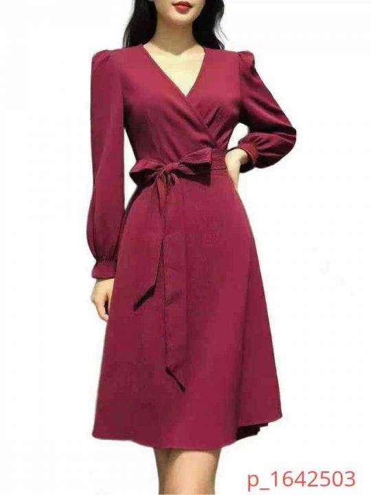 纯色裹胸款春秋季衩领束带灯笼袖长袖连衣裙