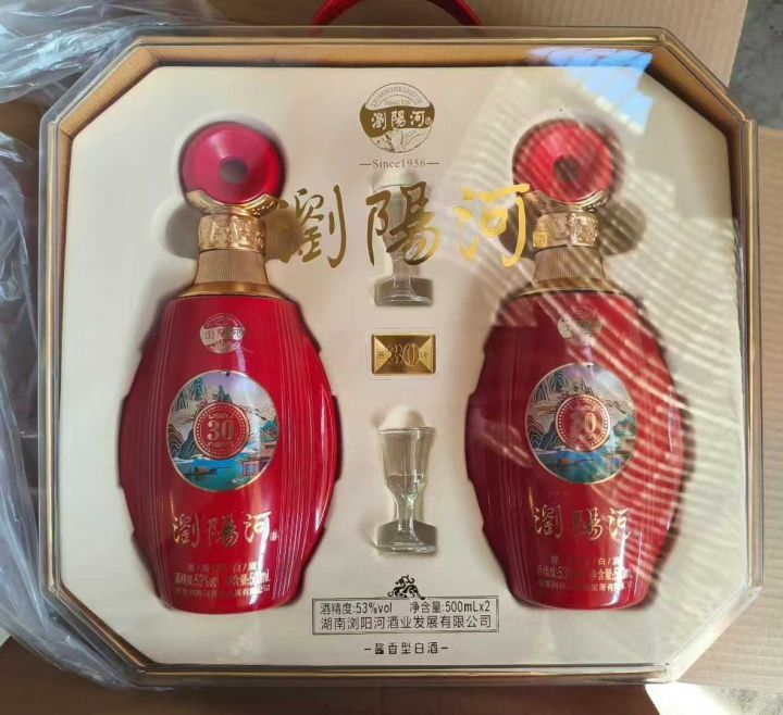 90多元一箱,还有最后50多箱,超大外箱浏阳河,高端手提箱,23年,53度,一箱3提,一提两瓶带两个酒杯,硬盒亚克力包装,不去拼多多售卖,还有几十箱