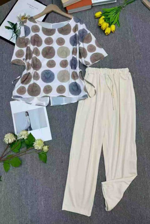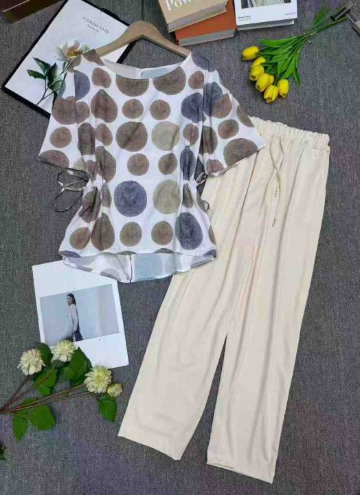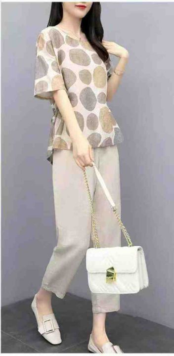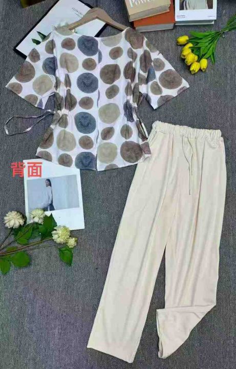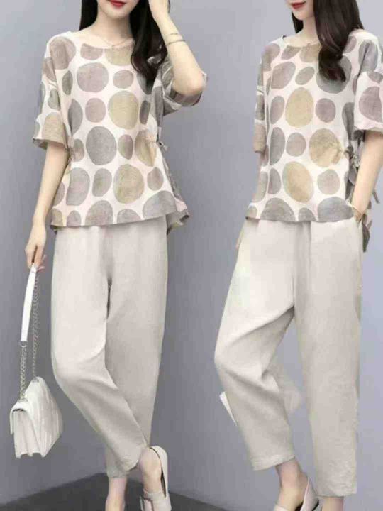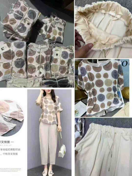 捡漏64套时尚套装女夏季雪纺印花收腰上衣九分裤宽松洋气两件套,独立包装,码数M-3XL,货号1014#30