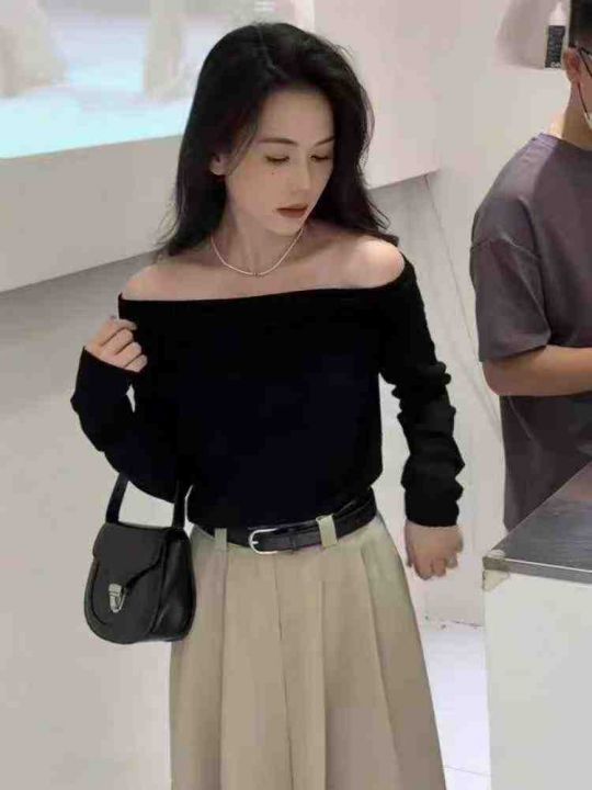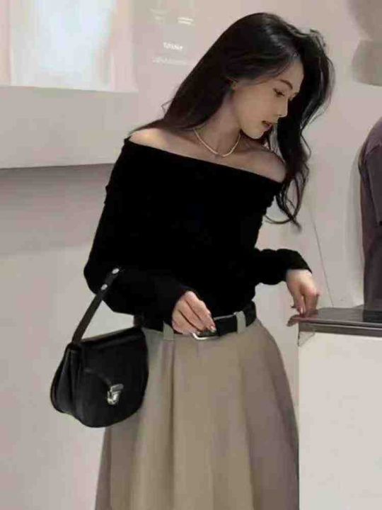秋冬新款黑色一字肩设计感辣妹包芯纱套头毛衣,独立包...
