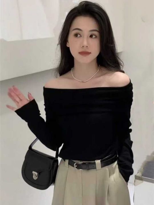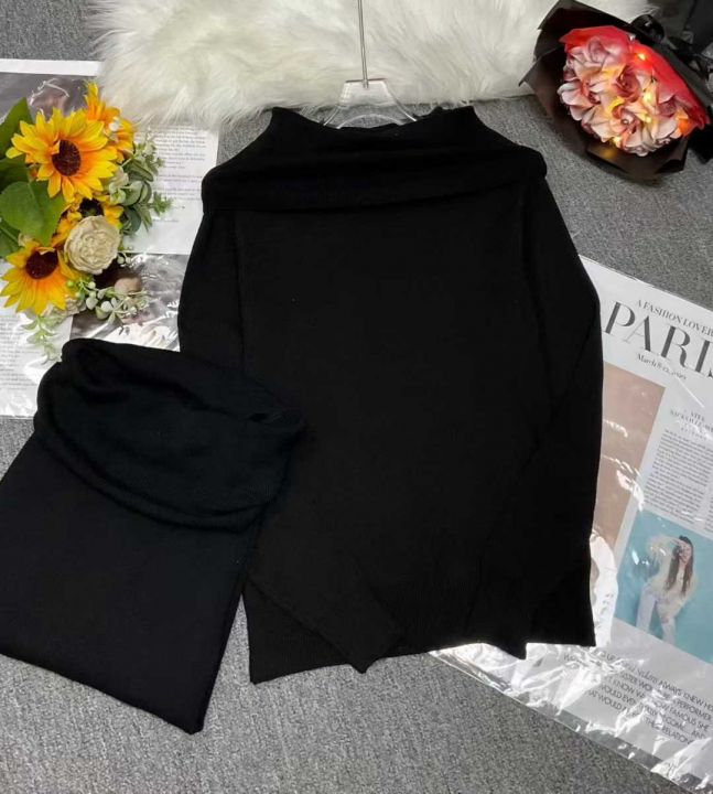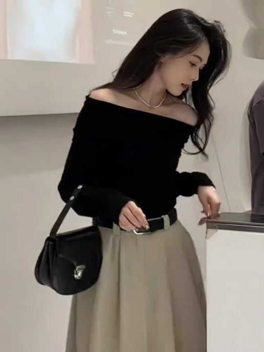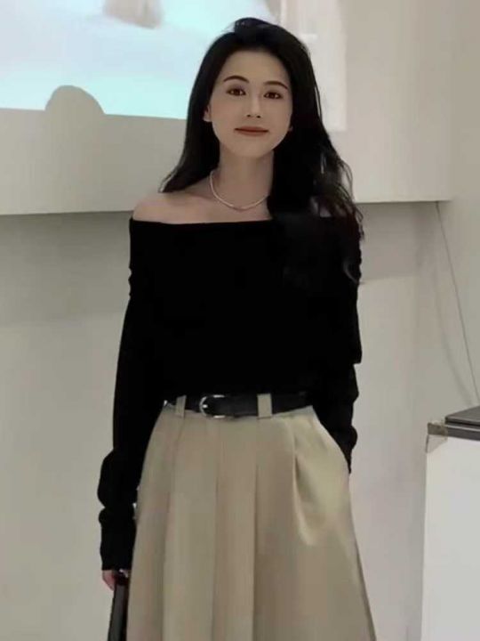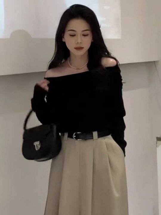 秋冬新款黑色一字肩设计感辣妹包芯纱套头毛衣,独立包...