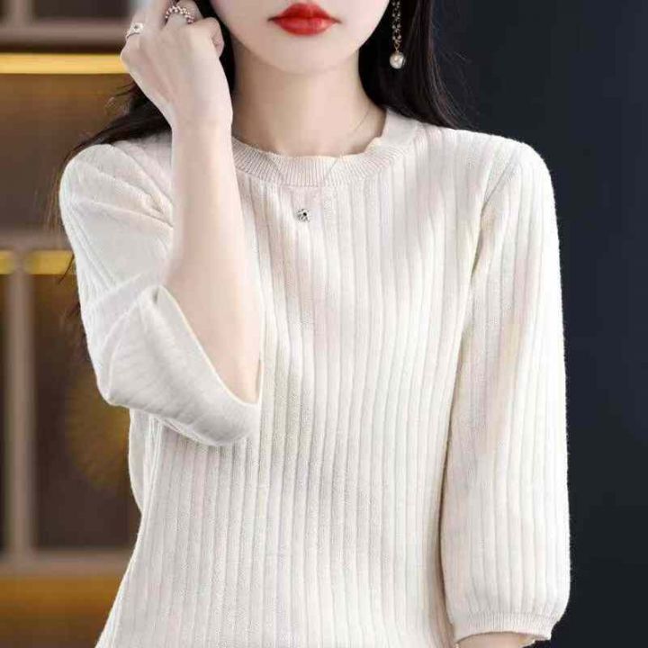 早秋新款宽松百搭七分袖圆领坑条螺纹包芯纱时尚套头毛衣,独立包装,均码面...
