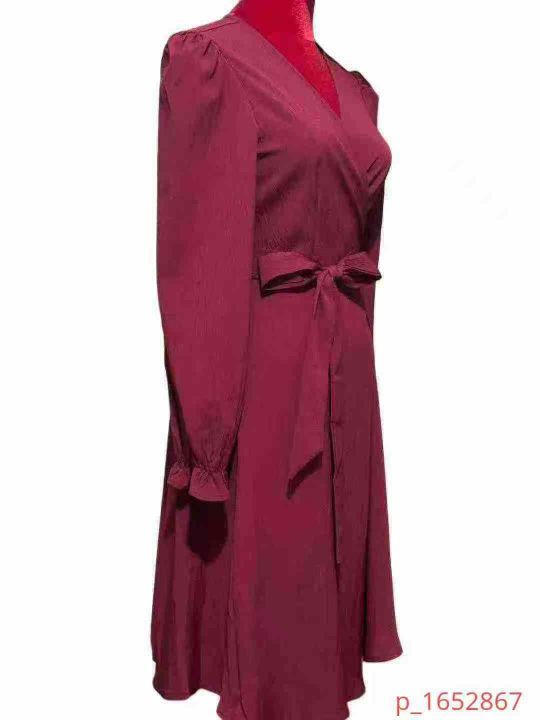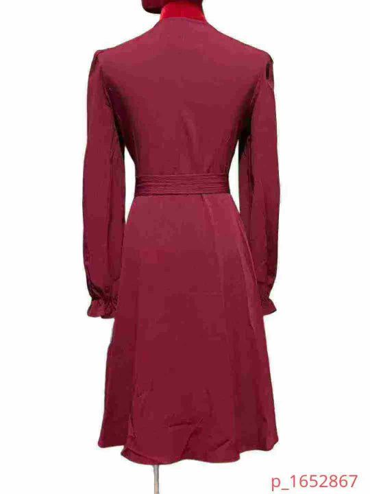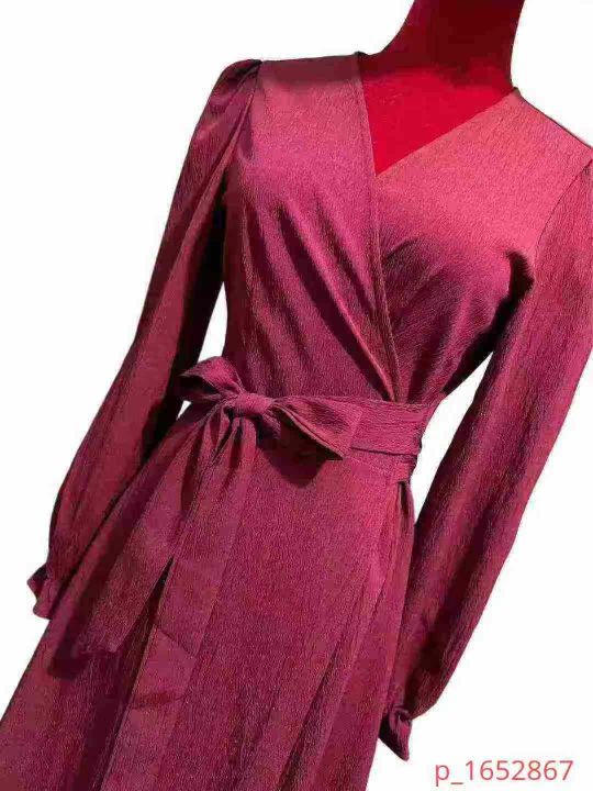 纯色裹胸款春秋季衩领束带灯笼袖长袖连衣裙