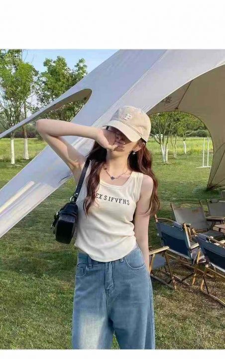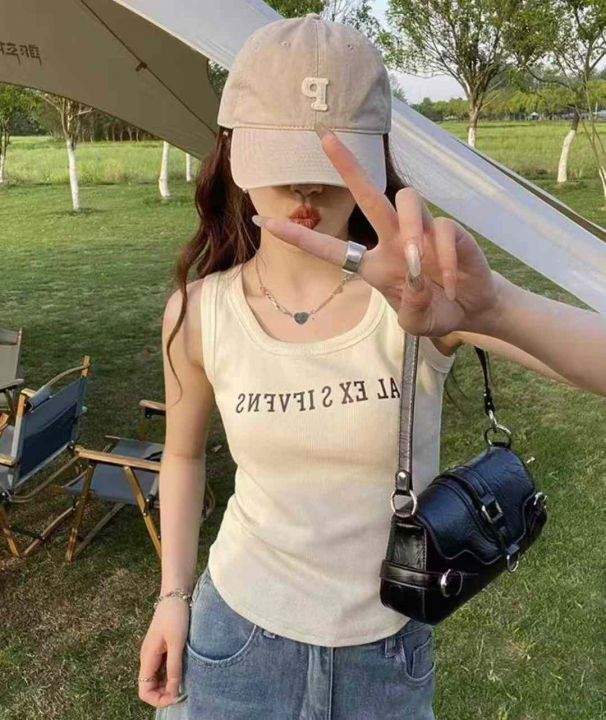 夏季新款高弹力辣妹性感纯欲风字母印花冰丝吊带背心,...
