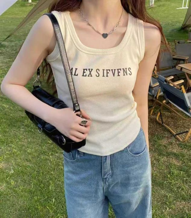 夏季新款高弹力辣妹性感纯欲风字母印花冰丝吊带背心,...