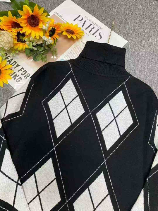秋冬新款高领菱形格拼色宽松加厚慵懒风提花包芯纱套头毛衣,独立包装,均码...