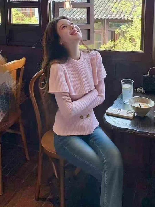 ① 高级感斗篷式粉色假两件针织上衣奶fufu慵懒风松弛感毛衣外套,独立包装...