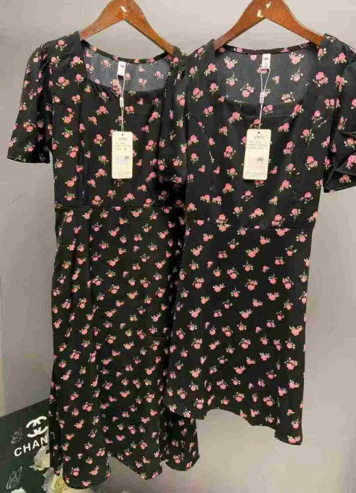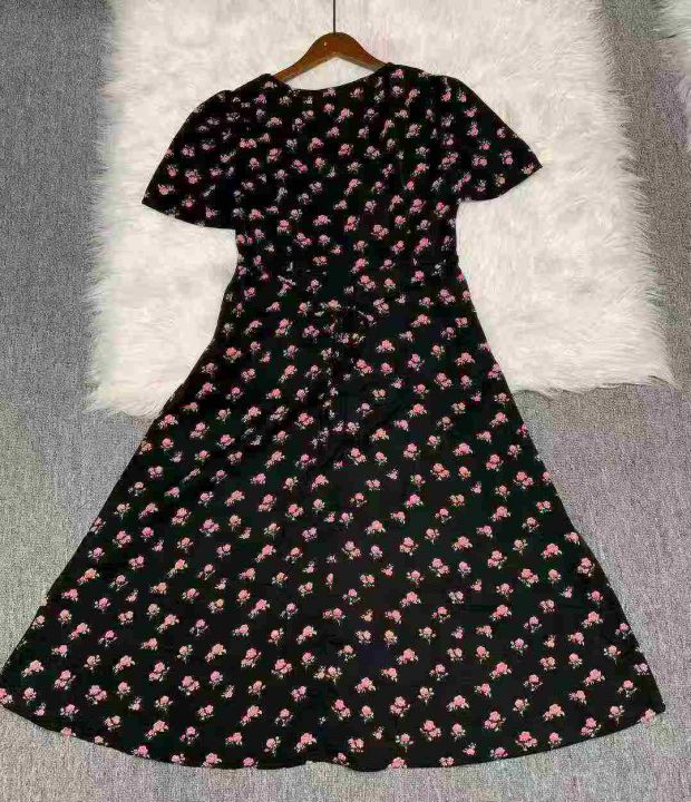 碎花裙女夏季新款女长款修身显瘦方领短袖小黑裙子法式收腰连衣裙260件,独立包装带吊牌,尺码S-3XL货品干净整洁,全清福利价12.8元