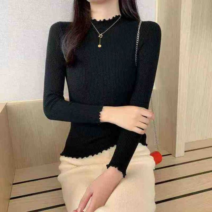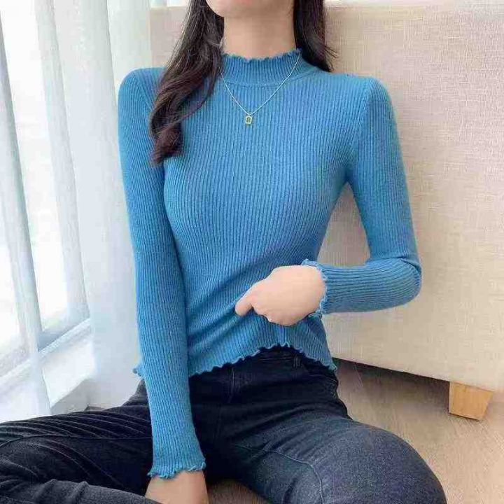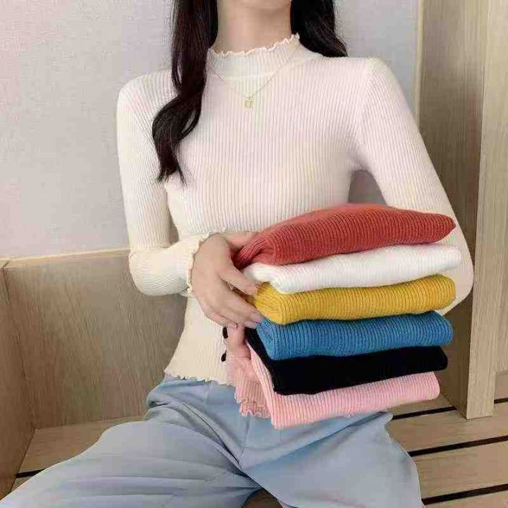 秋冬新款韩版百搭半高领木耳边坑条包芯纱套头毛衣,独...