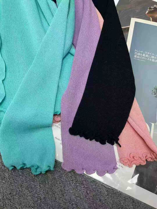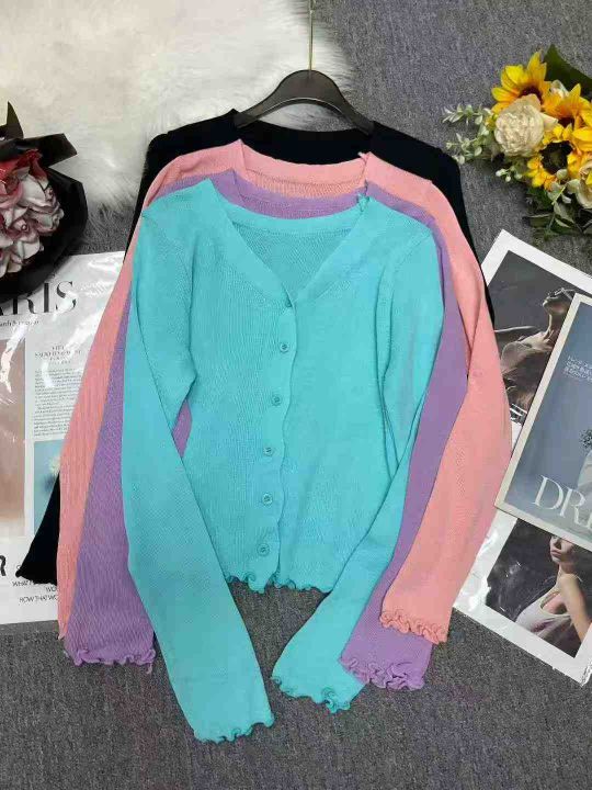 秋季新款木耳边纯色宽松百搭V领针织开衫,独立包装,...