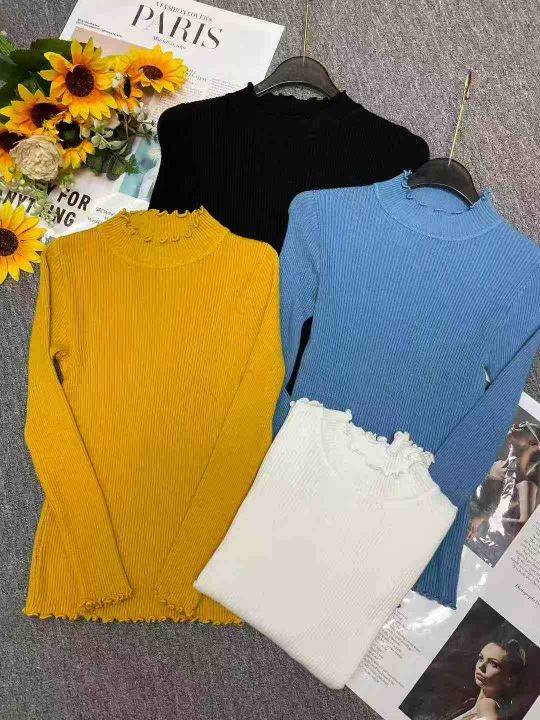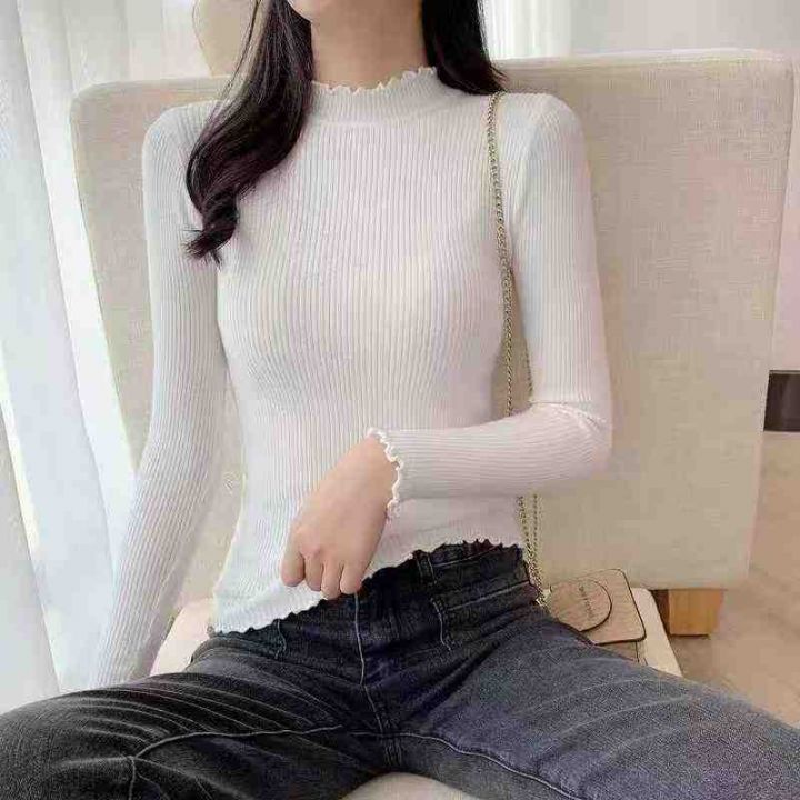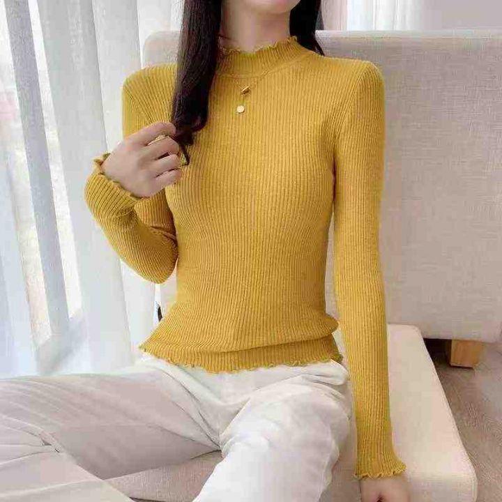 秋冬新款韩版百搭半高领木耳边坑条包芯纱套头毛衣,独...