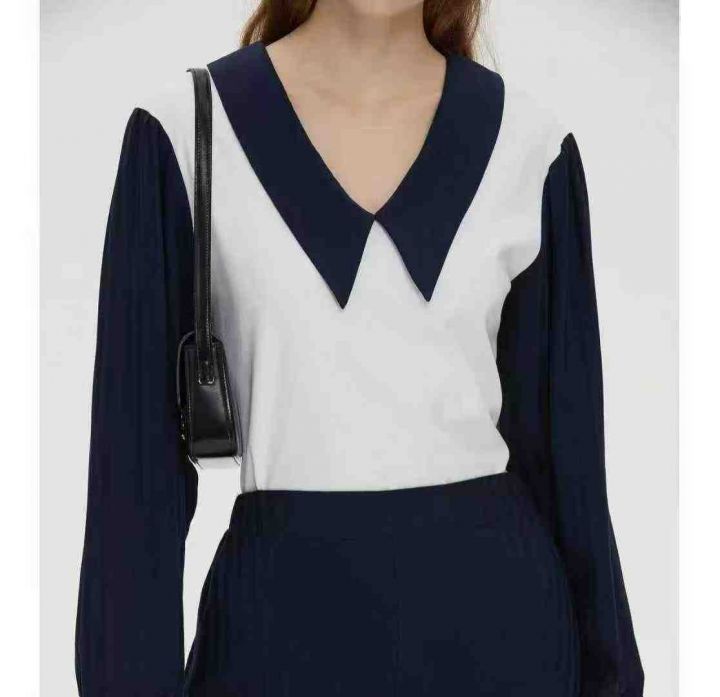 法式衬衫拼接雪纺灯笼袖设计假两件针织衫女新款V领上衣,独立包装,均码,3...