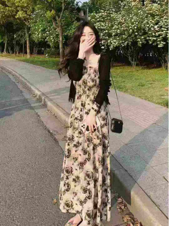 2025新款春法式高级感小个子长裙碎花吊带连衣裙女夏,...