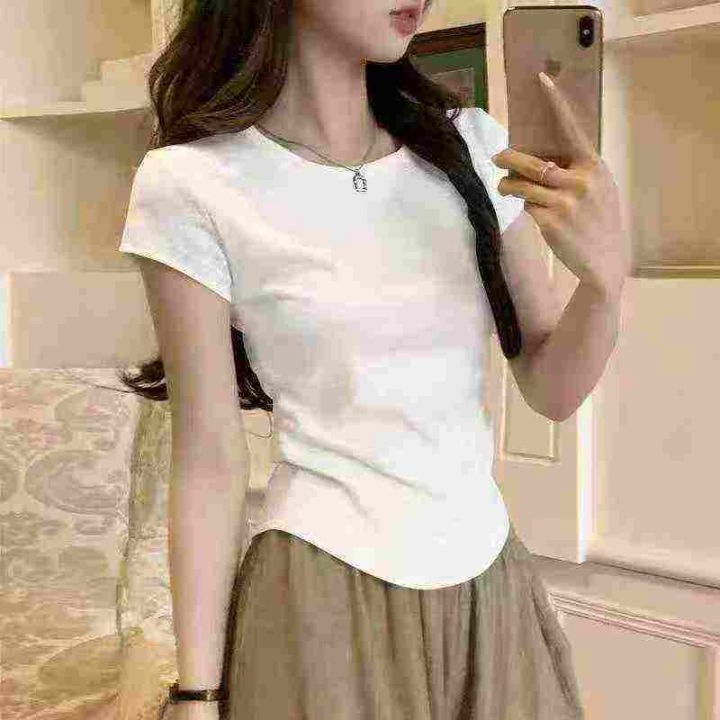 新款不规则短袖复古气质圆领修身弧形下摆螺纹T恤女,...