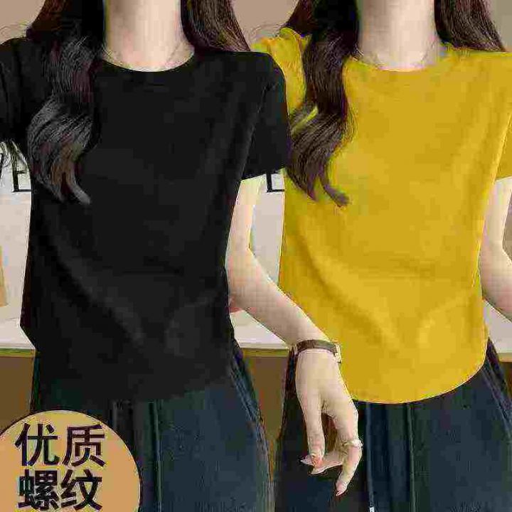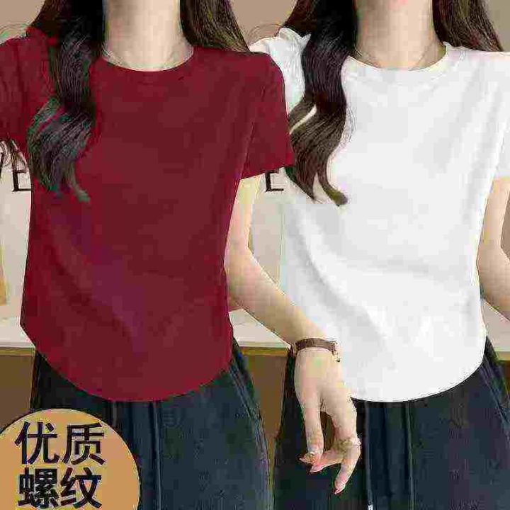 新款不规则短袖复古气质圆领修身弧形下摆螺纹T恤女,...