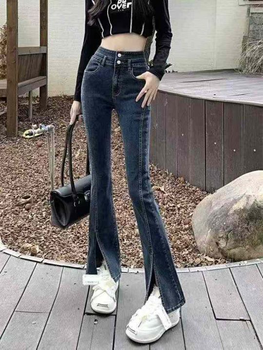 秋季新款高弹力微胖mm洗水棉网红爆款开叉牛仔喇叭裤,...