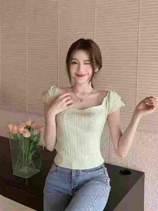 一字领泡泡短袖针织衫法式设计感小众性感短款露肩上衣...