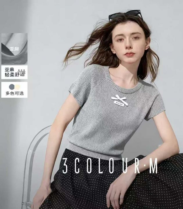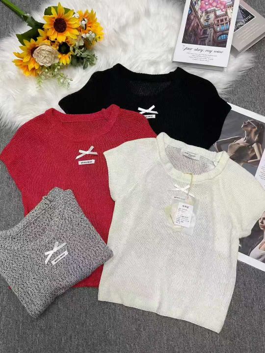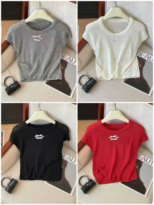夏季新款弹力修身显瘦蝴蝶结针织短袖,独立包装,均码...
