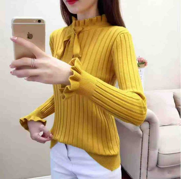 秋冬季新款蝴蝶结韩版弹力修身木耳边包芯纱套头毛衣,...