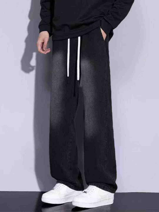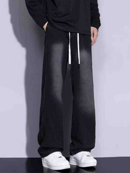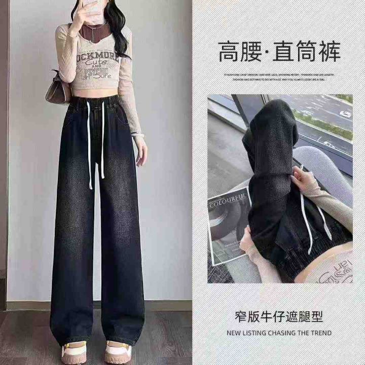 秋季新款男女同款高腰宽松百搭松紧腰牛仔直筒阔腿裤,...