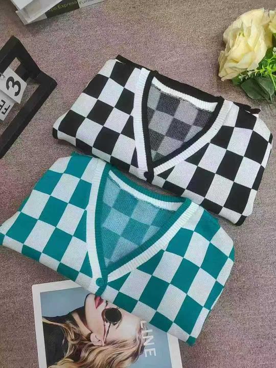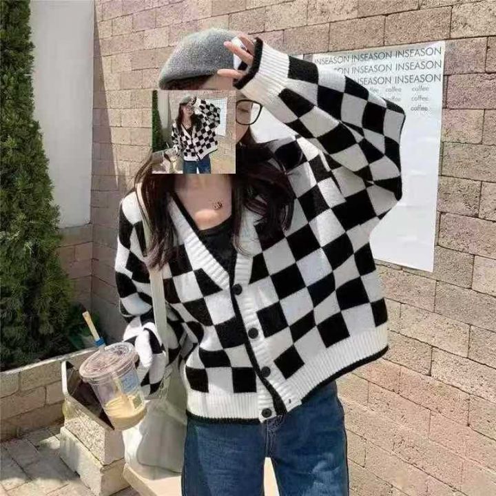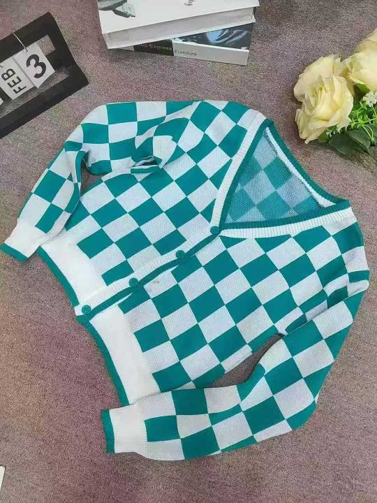 棋格子毛衣外套女春秋季2025新款复古日系慵懒风大版宽松V领针织开衫,独立包装,370件,清8.8,分➕1