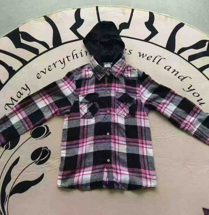 童装纯棉格子春秋长袖衬衣 数量350件左右 尺码6Y--12Y 带帽跟无口袋少量 其余都是图6带口袋 纽扣三个颜色 独立包装 货品干净整洁质佳