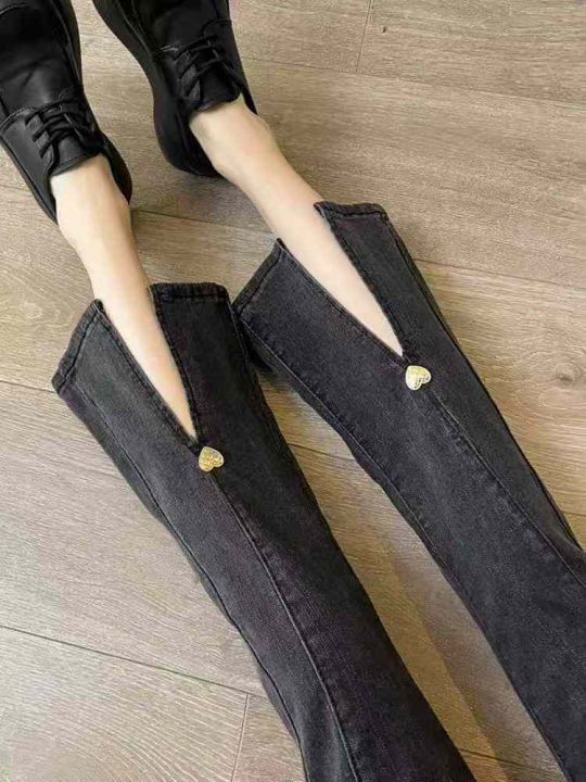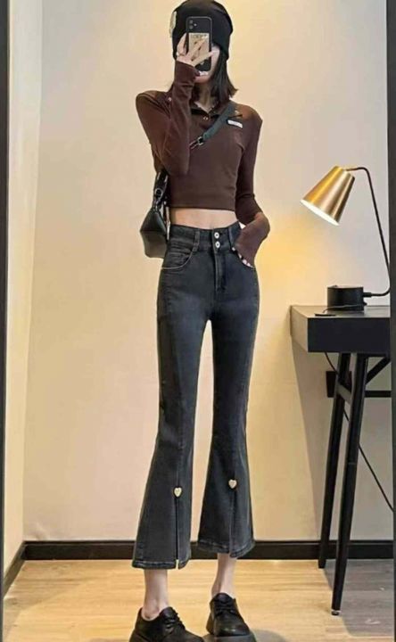 秋季新款高弹力设计感爱心开叉高腰显瘦九分微喇叭牛仔...